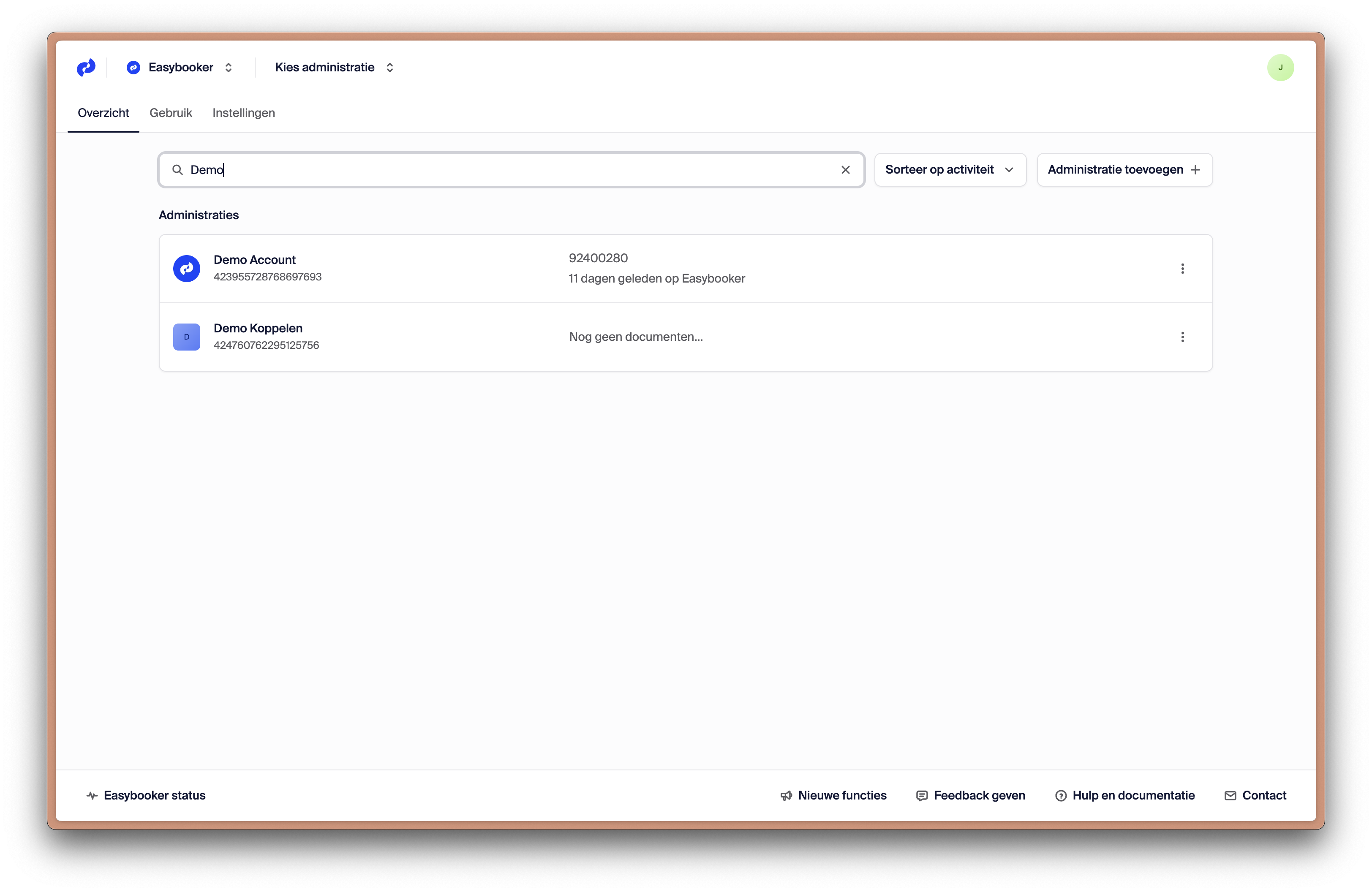 - Overzichtspagina: Je kunt zoeken op administraties en sorteren op activiteit. De meest actieve administraties worden als eerst getoond.
