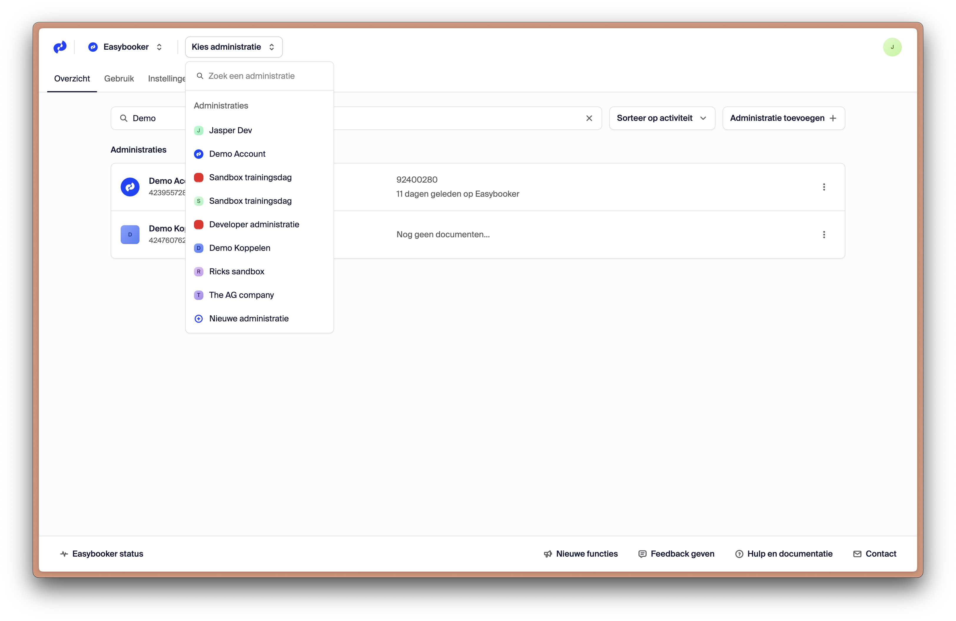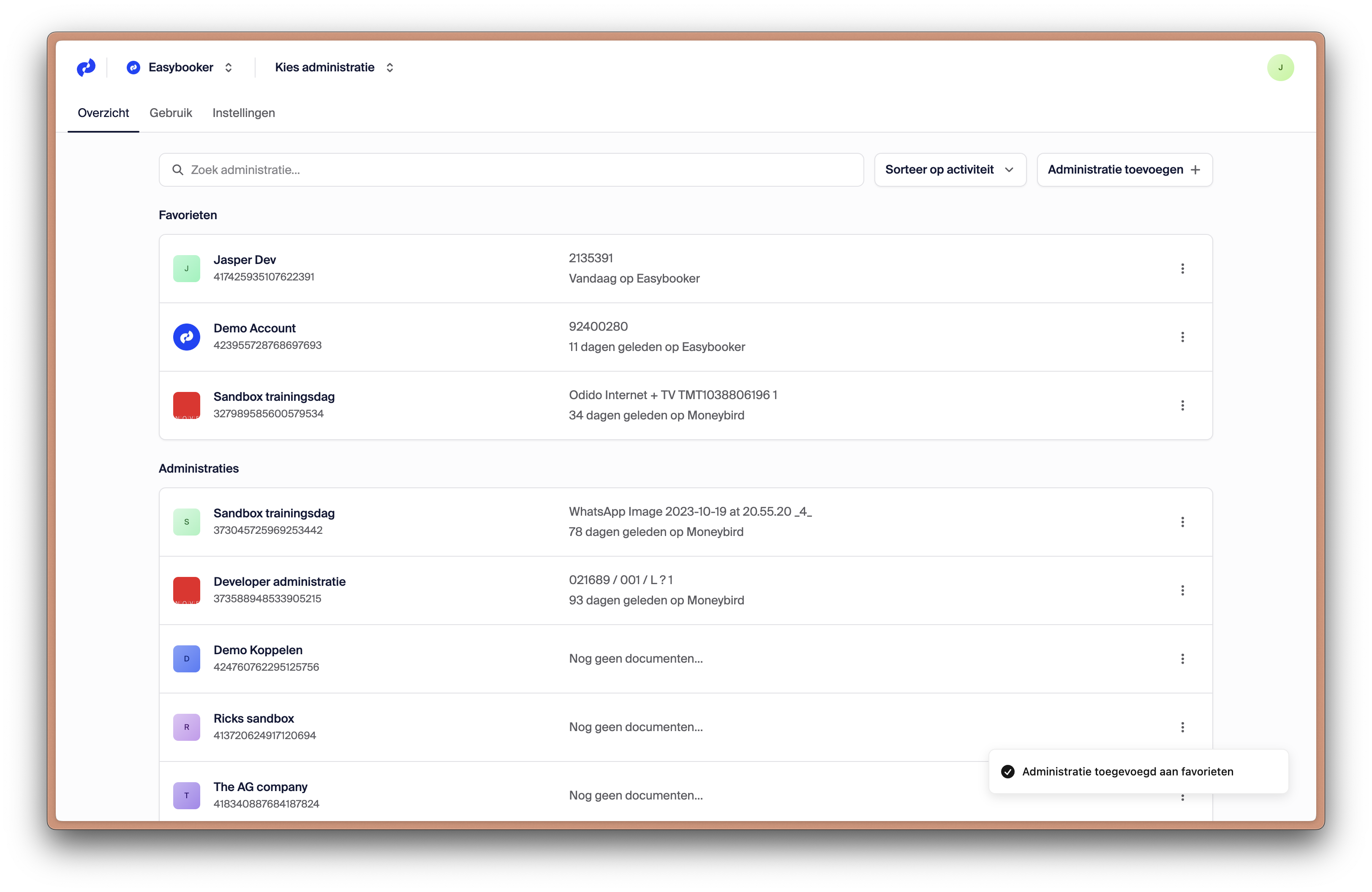 Via het nieuwe overzicht kun je snel de juiste administratie zoeken. Administraties kunnen worden gesorteerd op activiteit of op naam. Als je sorteert op activiteit, komen de meest actieve administraties bovenaan te staan.