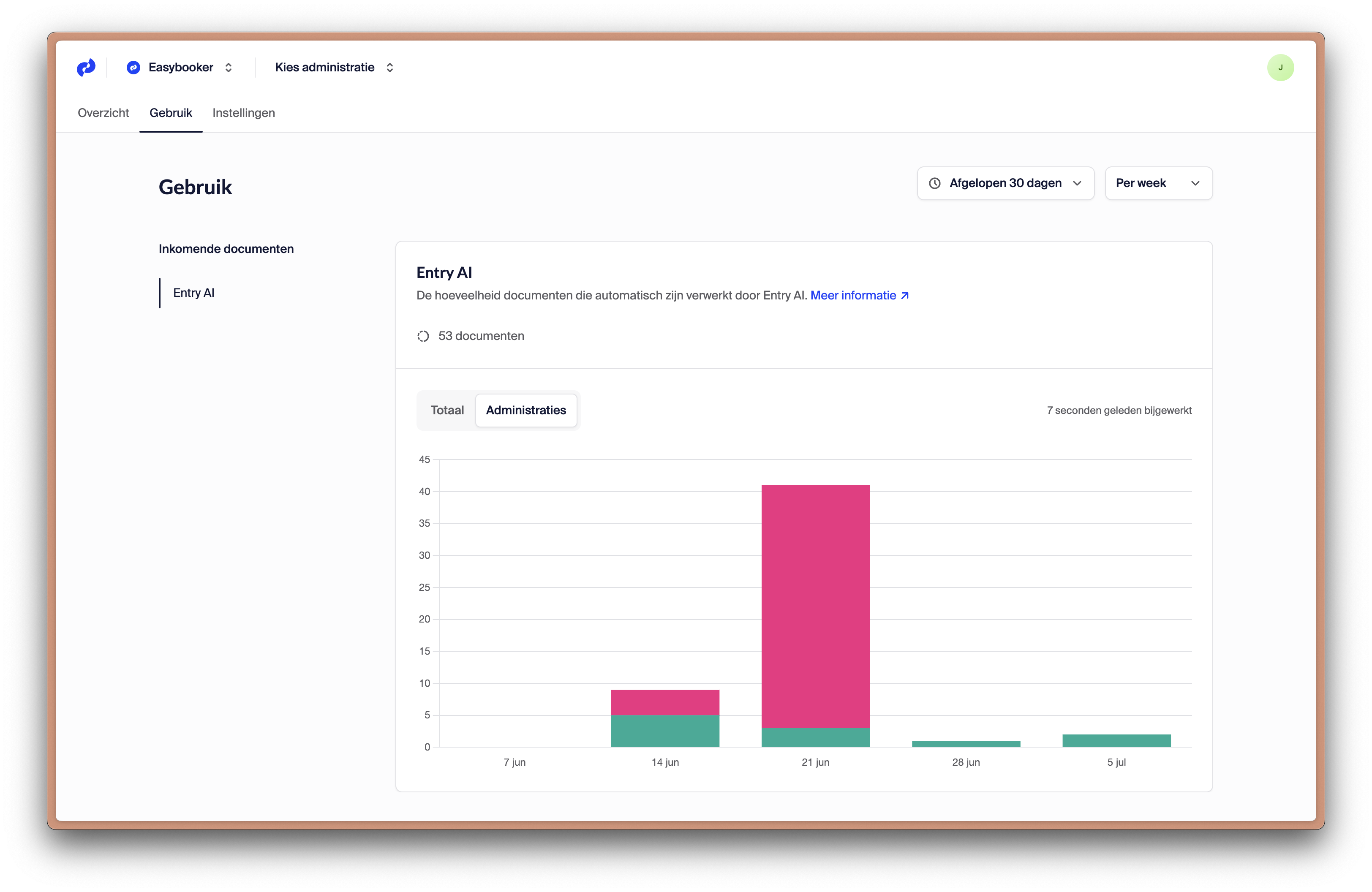 Voorheen was er één dashboard per administratie. Dat is nu veranderd naar één dashboard per team waar je kunt filteren op administratie. Nu zie je het aantal verwerkte documenten met Entry AI. In de toekomst komen hier meer grafieken bij.