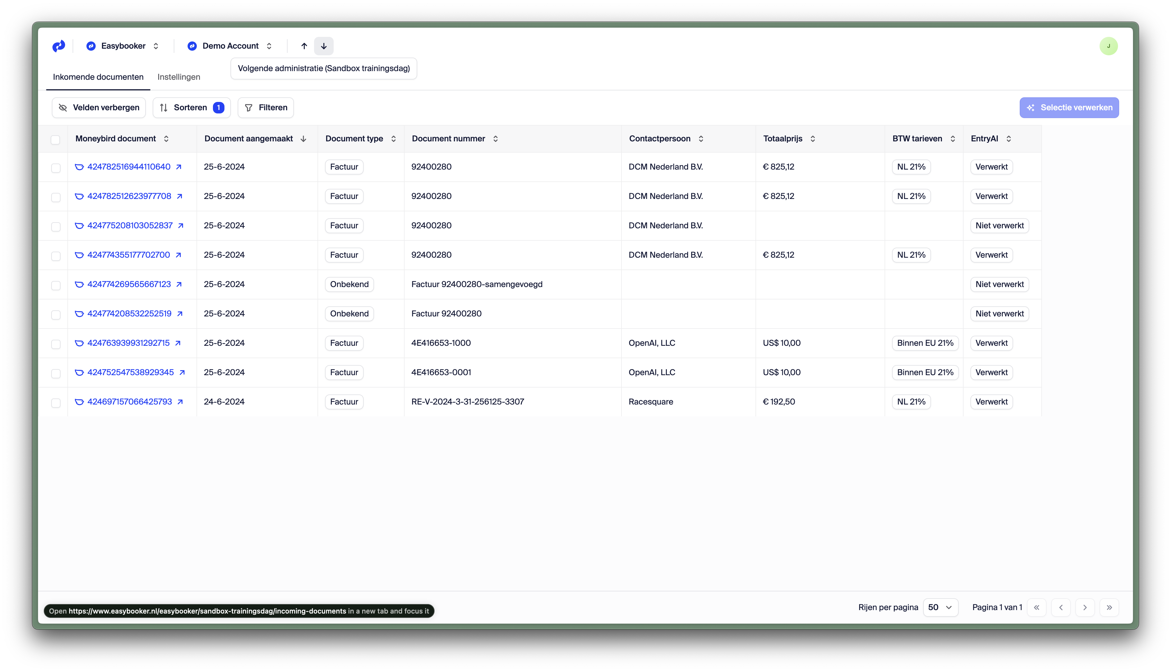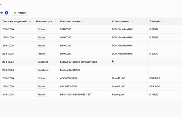 Je kunt nu de kolomgroottes wijzigen bij inkomende documenten. Je instellingen worden, net als bij filters, sorteren en velden verbergen, automatisch opgeslagen tussen bezoeken en administraties. Dus als je je favoriete instellingen hebt gevonden en je komt later terug, kun je doorgaan op de manier waarop je gebleven was.